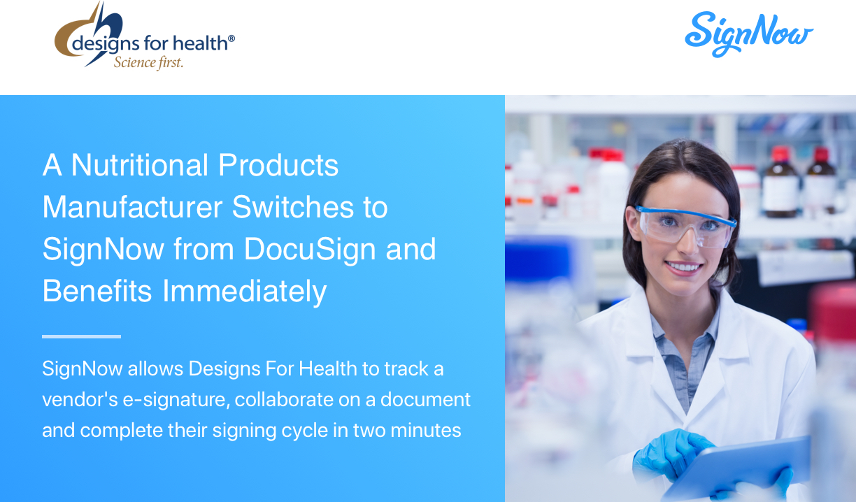 Customer Stories Editor’s Picks signNow provides a better patient experience and reclaims working hours for a Canadian IVF clinic For Atlantic Assisted Reproductive Therapies (AART), a fertility clinic in Halifax, Canada, patient care is of the utmost importance. Going through fertility treatments is an emotional process, and the ... Productivity How industries benefit from the signNow eSignature solution: Real-life success stories of our customers With digital transformation on the rise, it’s not surprising that more and more businesses are choosing in favor of eSignature adoption. In fact, the global market for eSignature is ... Productivity signNow for Healthcare: The ultimate guide to HIPAA-compliant electronic signature Prioritizing patient care over paperwork with HIPAA electronic signature The healthcare industry is still reeling from the challenges brought on by the pandemic. Now more than ever, it is ... News & Press Coronavirus outbreak: signNow grants a free 3-month subscription to all US-based healthcare institutions The world is facing new challenges. And, while many of us still do not know how to react, there are people who’ve been involved since the very first recorded ... Customer Stories HIPAA compliant eSignatures for optometry clinics: the case of Zionsville Eyecare Customer profile Zionsville Eyecare, Indiana. An optometry office with 30 employees using signNow on a daily basis. My goal is to make sure we are running as efficiently as ... Productivity SignNow helps healthcare business owners protect patient processes The total U.S. healthcare expenditure in 2015 was $3.2 trillion. That’s a lot of money – enough to buy Apple Inc. three times over. By 2026, healthcare spending is ... Customer Stories Designs for Health, nutritional products manufacturer, switches to signNow and benefits Immediately Customer profile Gary Xu is the Chief Accounting Officer, in charge of all financial and accounting activities for Designs For Health, a leading research-backed nutritional products manufacturer and distributor. ... Productivity When to use Radio Buttons and Checkboxes in your Documents When you’re adding fields to a document in SignNow, you might want to let your recipient select specific options on the document. However, you might be unsure on whether ...